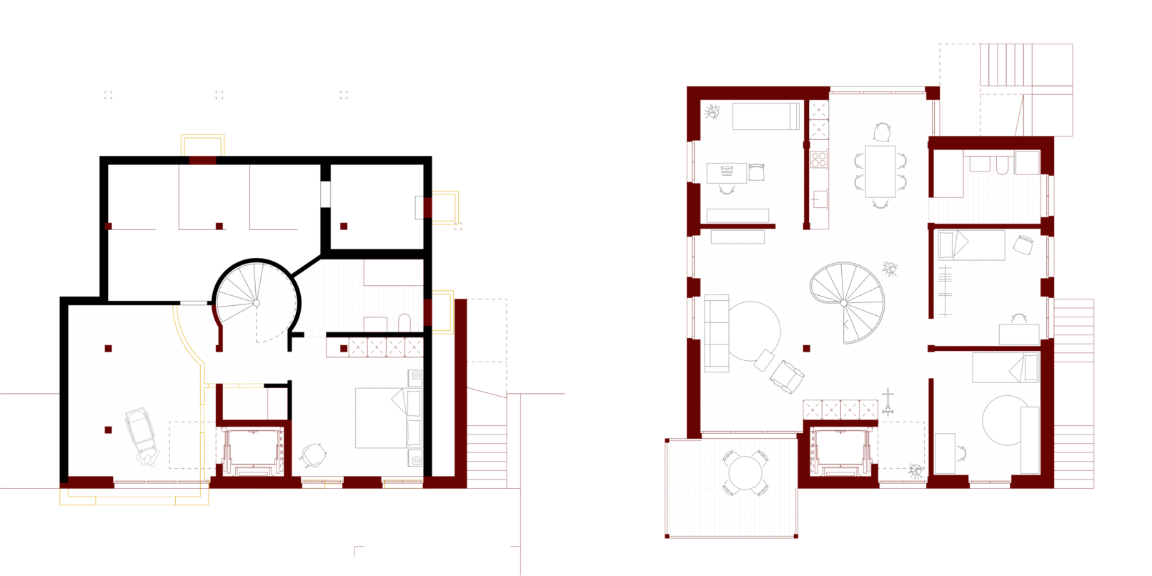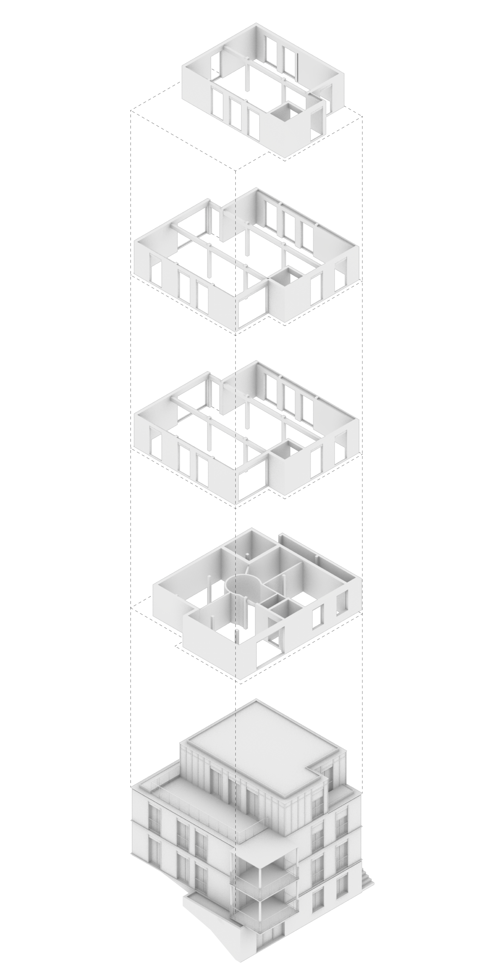 Das flache Pyramidendach und die Wände im Erdgeschoss werden rückgebaut, da der Grundriss für den geplanten Weiterbau zu grossen Kompromissen führen würde. Das verbleibende Sockelgeschoss wird um zwei Vollgeschosse und ein Attikageschoss als Holzelementbau aufgestockt. Das Untergeschoss wird so umgebaut, dass ein grosszügiger Eingangsbereich mit Liftvorplatz, Abstell- und Technikflächen, sowie ein Eingangsbereich mit Zimmer und Nasszelle für die 5.5-Zimmerwohnung im EG entsteht. Die bestehende runde Treppe bleibt dabei erhalten und wird als interne Verbindung der Erdgeschosswohnung weitergenutzt.