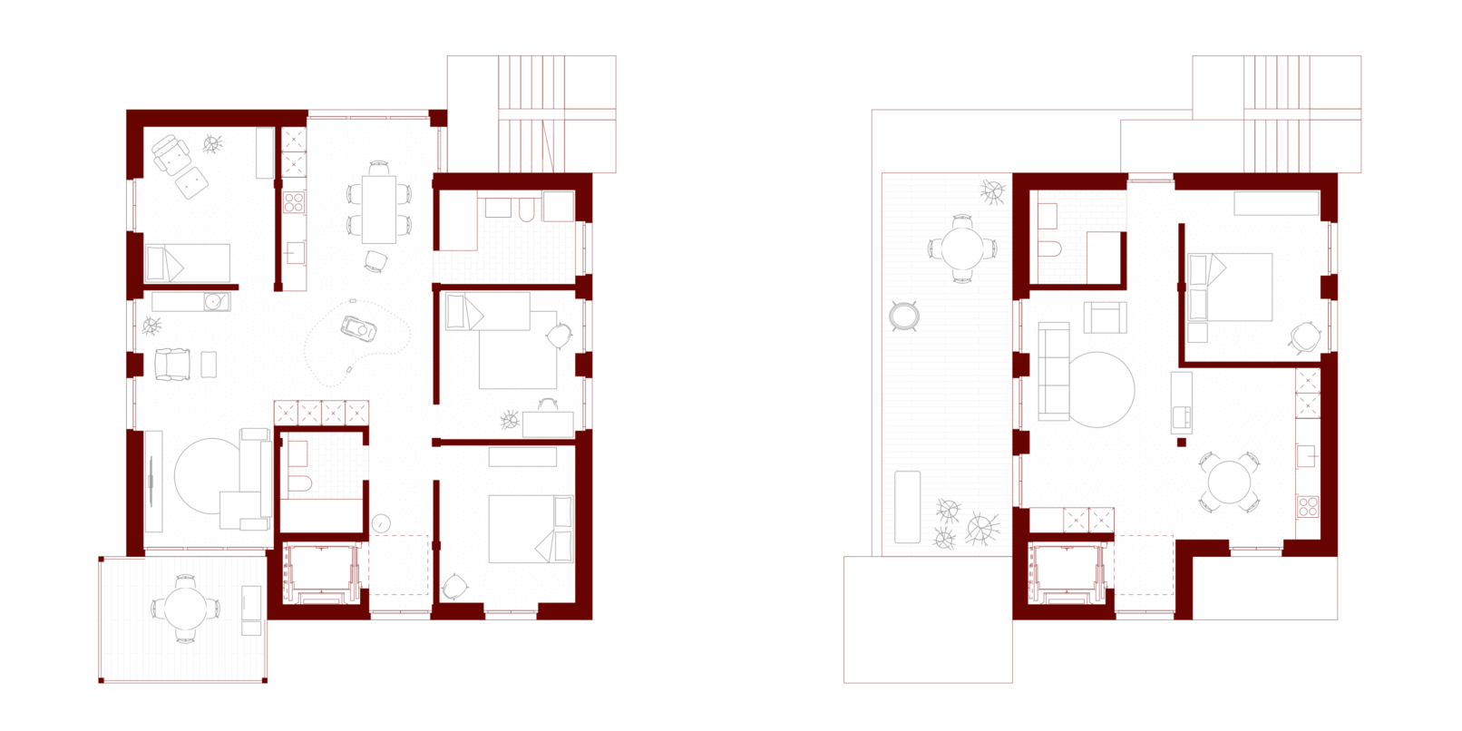 Im 1.OG entsteht eine 4.5-Zimmerwohnung, darüber eine kleine 2.5-Zimmer Attikawohnung. Die Einheiten sind primär über den internen Aufzug oder über eine Fluchttreppe im hinteren Bereich der Parzelle erschlossen.