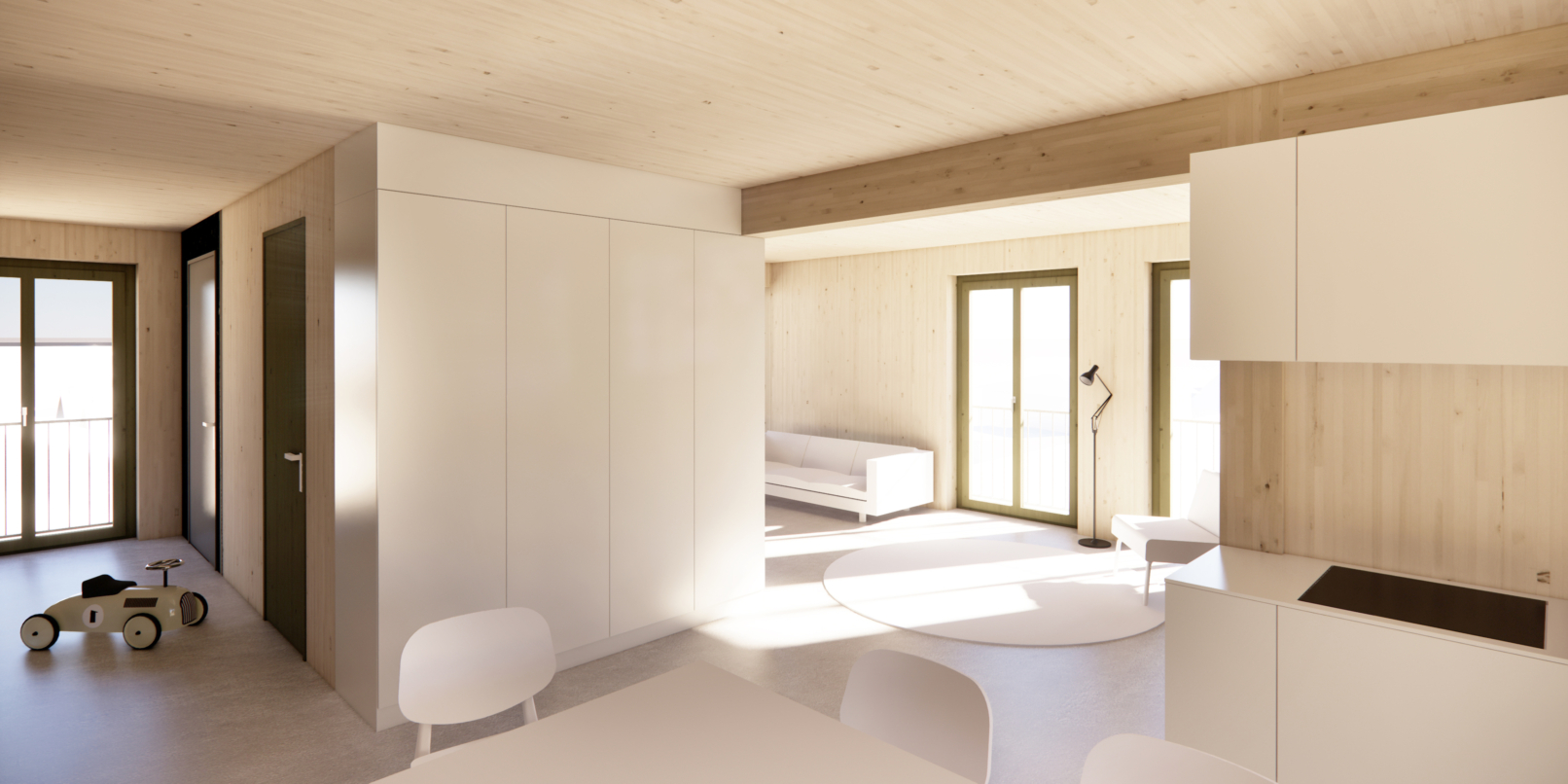 Der beinahe quadratische Grundriss wird durch den Einschub eines Balkons auf der Südwestseite und durch den Einschub der Fluchttreppe auf der Nordostseite aufgelockert. Die Grundfläche ist in drei ähnlich breite Felder aufgeteilt, wodurch für den Holzbau ökonomische Spannweiten entstehen. Die Aussenwände und die Stützen in der Grundrissmitte sind lastabtragend ausgeführt, damit für die Grundrissgestaltung eine gewisse Flexibilität entsteht. Der Holzelementbau ist nach dem Prinzip „Design for Reuse“ konzipiert, damit bei einem allfälligen Rückbau die Baustoffe zurück in den Materialkreislauf gelangen.