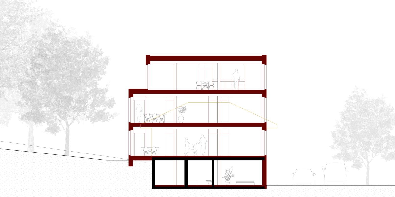 Die Parzelle liegt in einem Einfamilienhausquartier an einem leicht geneigten Südhang. Heute bestehend ist ein kleines EFH mit einem Unter- und einem Erdgeschoss. Aufgrund der Revision der Bauordnung kann das schlecht ausgenutzte Grundstück nachverdichtet werden. Ziel ist die Erstellung von 3 eigenständigen Wohnungen durch eine Aufstockung des Bestands.