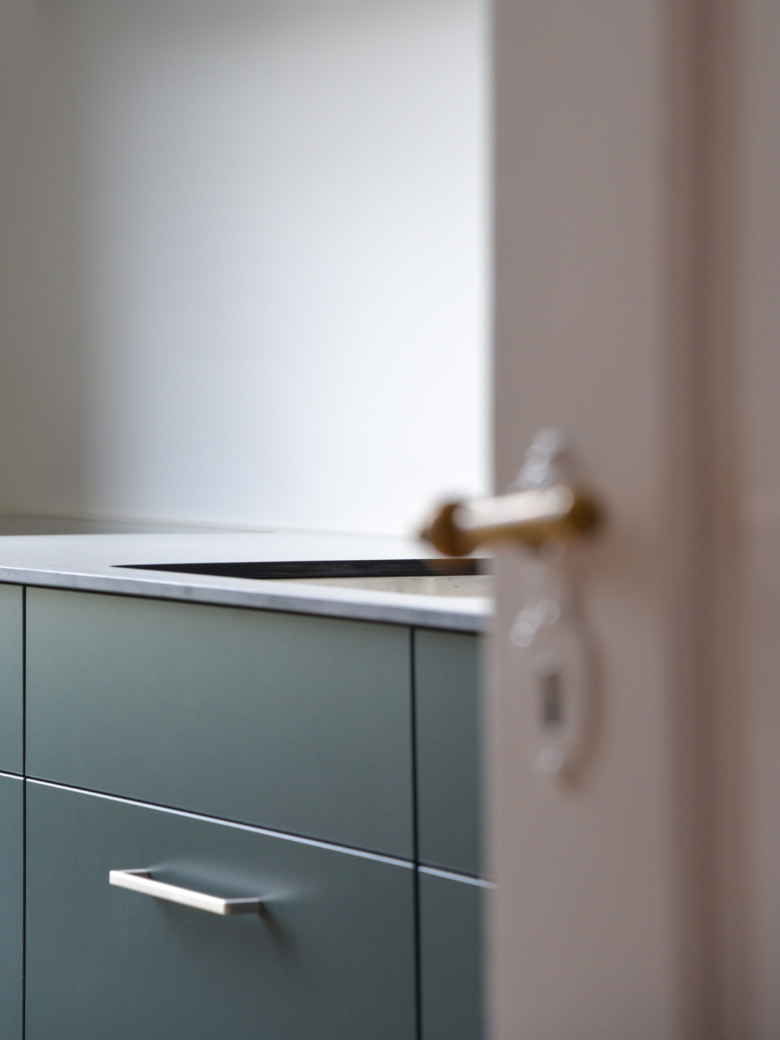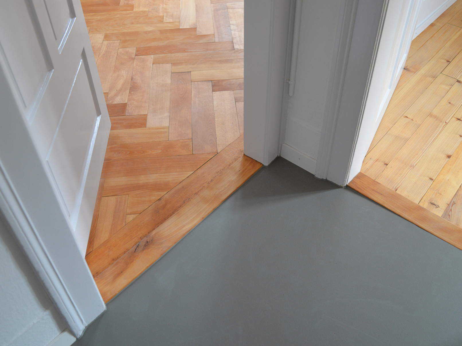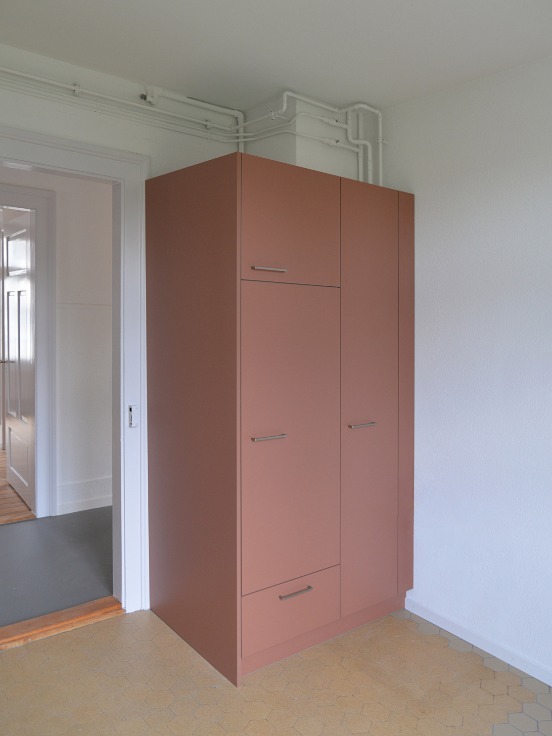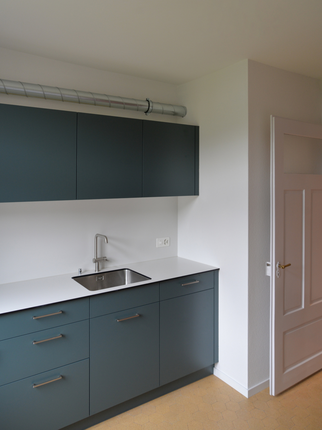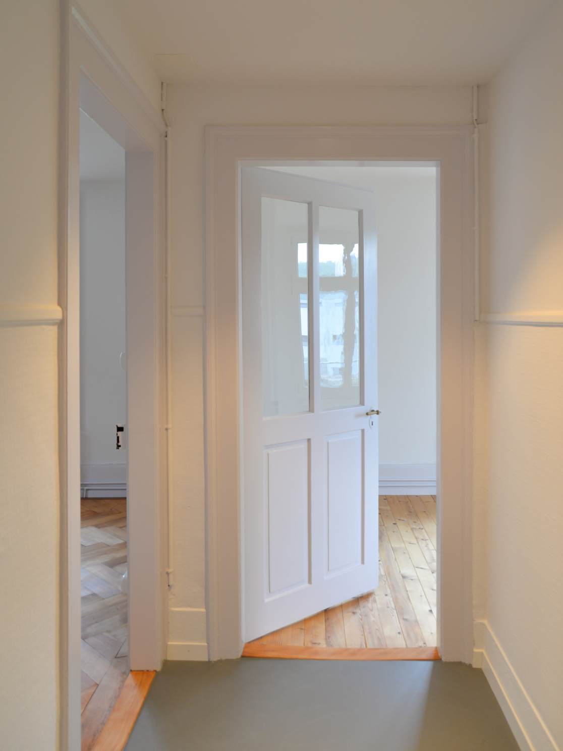 Die Wohnung im ersten Stock wurde seit über 50 Jahren nicht mehr umfassend saniert. Die Küche war sehr einfach – mit einem Spülbecken, einem freistehenden Kühlschrank und einem Gasbackofen – auch ein Duschkabine stand darin. Eine Renovierung war daher dringend nötig. Die Küche bekam ein frisches Farbkonzept, das die Nutzung unterstreicht. Die Zimmer wurden einfach renoviert: Der Parkettboden wurde abgeschliffen und geölt, und die Wände wurden neu gestrichen. Der ursprüngliche Stil musste erhalten bleiben, aber das Budget war begrenzt, da die Wohnung als günstiger Wohnraum für junge Leute gedacht ist. Der Küchenboden wurde grösstenteils beibehalten und nur an einigen Stellen ergänzt. Für die Fliesen im Bad wurden Restbestände aus einem größeren Bauprojekt verwendet. Im Flur sorgt ein Linoleumboden für einen neutralen Übergang zwischen den Räumen.