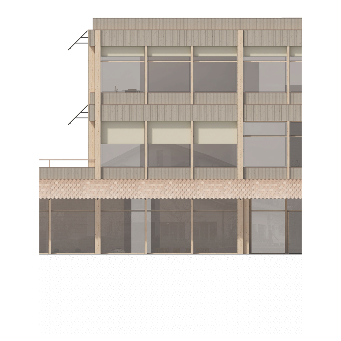 Die durch das Stützenraster entstehenden Felder sind im Erdgeschoss durchgehend verglast. Opake Fassadenteile und die Fensterbrüstungen der Obergeschosse werden mit einer vertikalen Holzschalung in verschiedenen Ausformulierungen verkleidet. Über den Glasflächen wird als Witterungs- und Sonnenschutz ein Vordach aus PV-Schindeln montiert. Die horizontal abgewinkelt verlaufenden Bänder erinnern an die traditionellen Holzbauten der Region.
