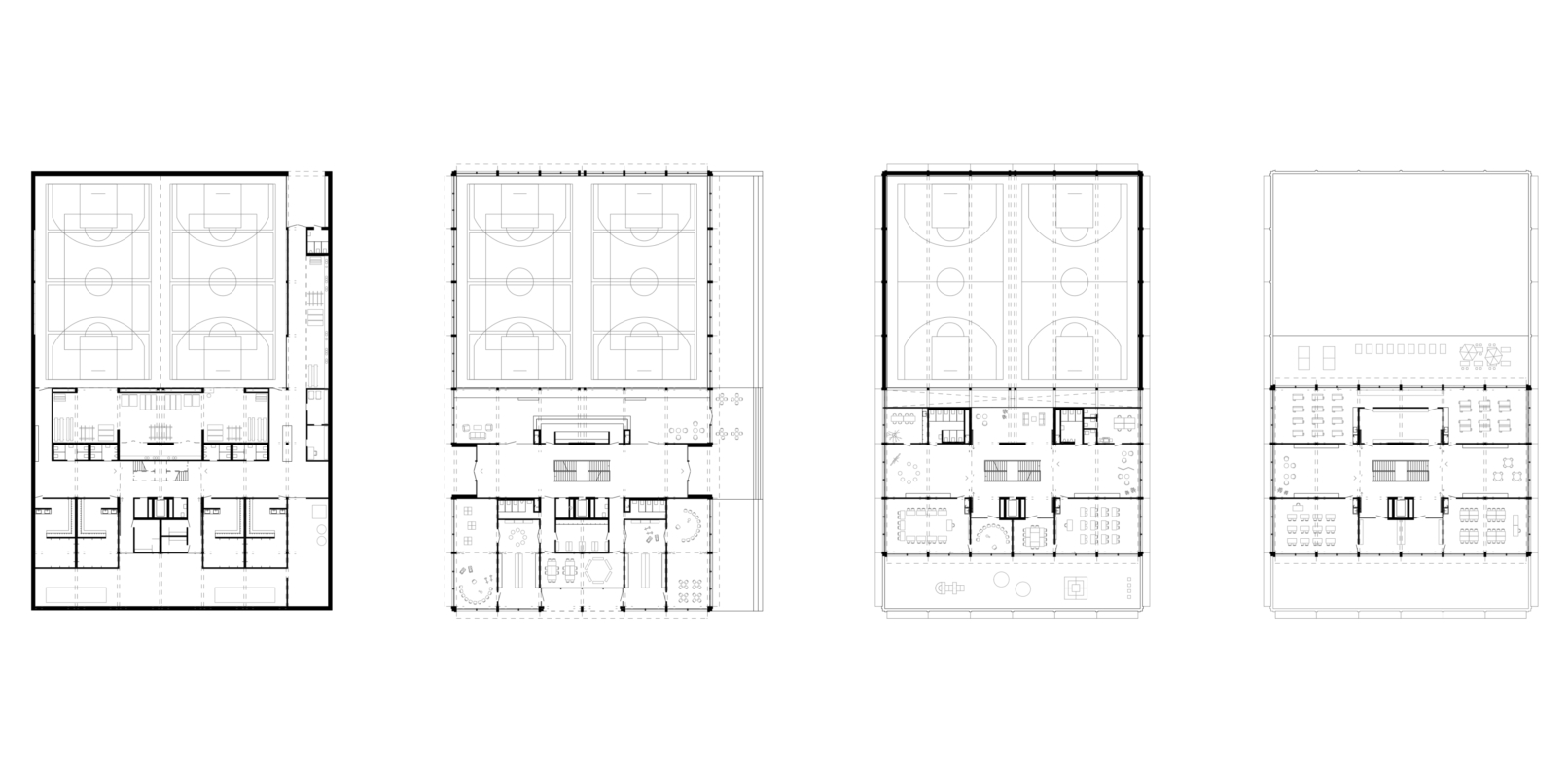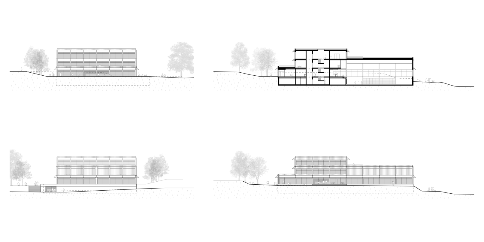 Der grosse Platz vor der Sporthalle dient als Ankunfts- und Aufenthaltsort. Zentral angeordnet ist der Hauptzugang zum Gebäude, welcher als Eingang für die Schulräume und die Turnhalle funktioniert. Die klare Organisation der Klassen- und Gruppenräume ermöglicht eine hohe Flexibilität. Auf jedem Geschoss wird ein Aussenraum angeboten, welcher im Sommer als erweitertes Klassenzimmer funktioniert. Über das zentrale Treppenhaus haben SchülerInnen einen direkte Verbindung zu den Garderoben im Untergeschoss und somit kurze Wege zum Sportunterricht. Ein zweiter Eingang zur Sporthalle ermöglicht eine vom Schulbetrieb getrennte Vereinsnutzung. Auf der Südfassade des Gebäudes, direkt neben dem Spielplatz, befindet sich der Eingang zum Kindergarten.