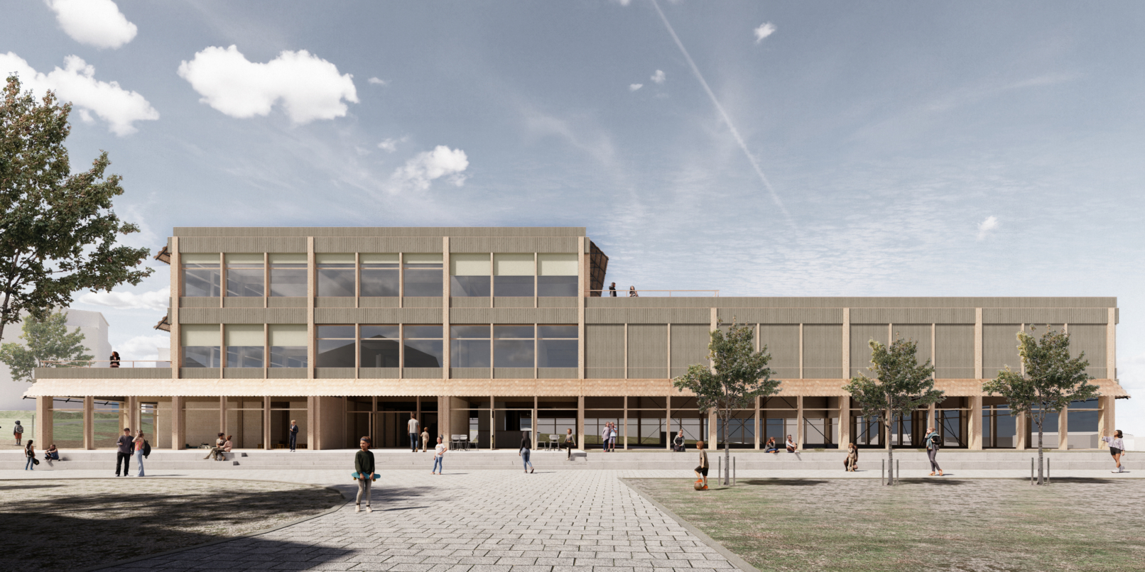 Zwischen der bestehenden Schulanlage und dem Neubau entsteht ein Platz mit mehrheitlich sickerfähigen Belägen und hoher Aufenthaltsqualität. Der Aussenraum wird zur Schnittstelle zwischen Schule, Turnhalle, Kindergarten, Aussensportflächen und den beiden Spielplätzen. Südseitig vom Gebäude schaffen diverse Baumgruppen mit einheimischen Arten schattige Plätze im Sommer.