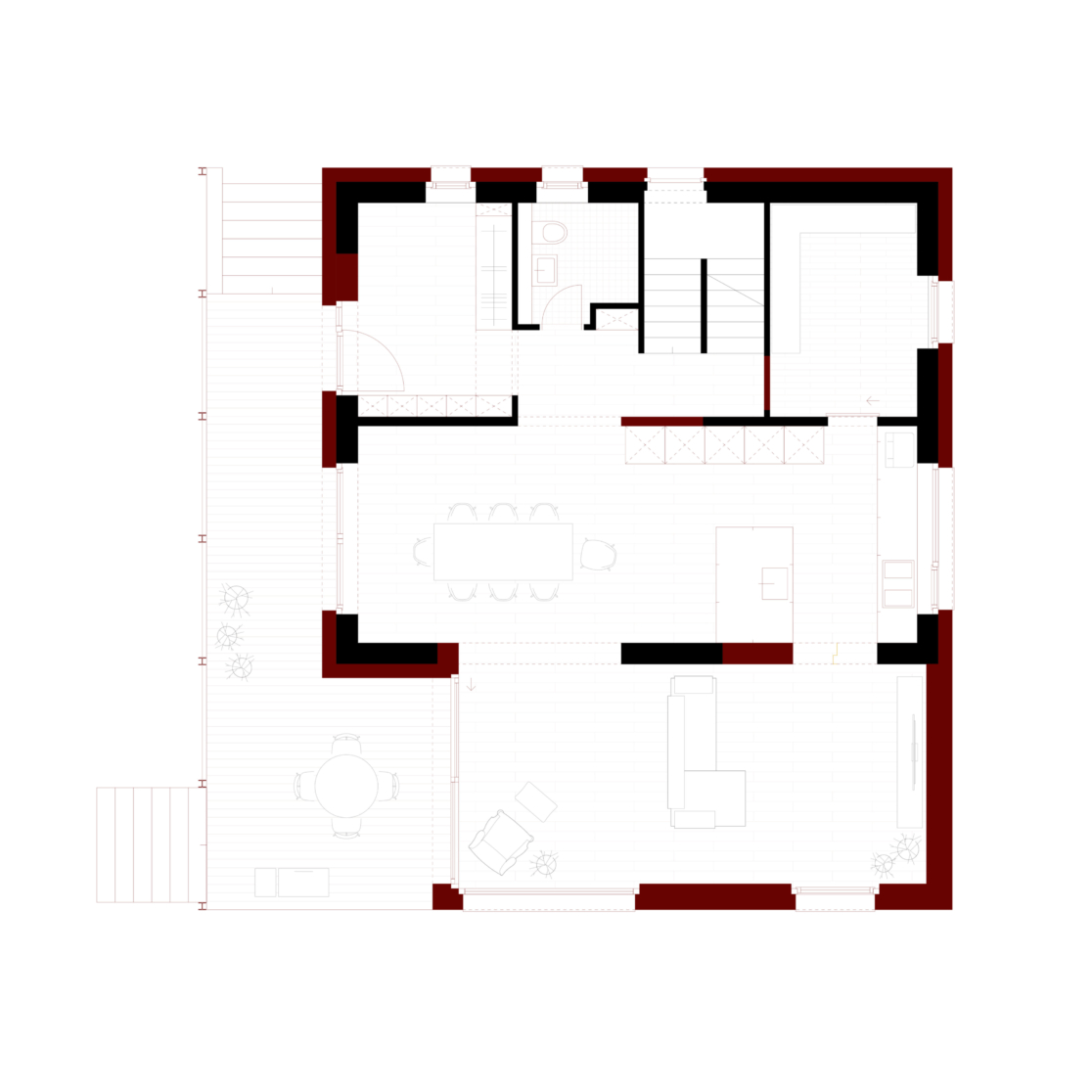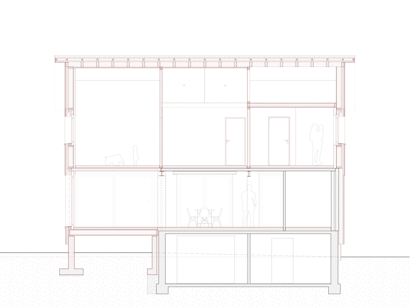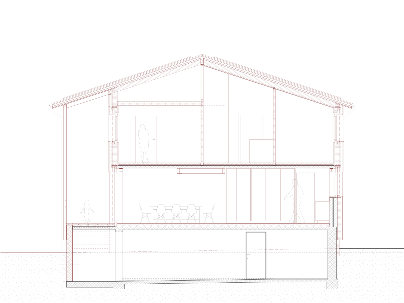 Das Dachgeschoss wird bis auf die Decke über EG rückgebaut, da bei einem Erhalt viele strukturelle Anpassarbeiten und eine Anhebung des Dachstuhls notwendig würden. Im Erdgeschoss werden für die Öffnung des kleinteiligen Grundrisses diverse Rückbauarbeiten und der Einbau von Trägern notwendig. Auf das bestehend bleibende Erdgeschoss wird eine Aufstockung vorgesehen. Nach Südwesten wird der Grundriss um eine zusätzliche Raumschicht mit Wohnzimmer im EG und zwei Zimmern im OG erweitert. Die Aufstockung und die Erweiterung werden als Holzelementbau konzipiert. Nach Westen zum Garten- und zur Eingangsseite wird eine gedeckte, zweigeschossige Veranda in ganzer Gebäudebreite vorgesehen. Diese übernimmt dabei mehrere Funktionen. Sie wird zur neuen Eingangssituation, ist eine aussenräumliche Erweiterung des Esszimmers und bietet einen gedeckten Sitzplatz in Verlängerung des Wohnzimmers. Zudem wird die im Sommer stark besonnte Westseite verschattet und sorgt für angenehmere Temperaturen in den dahinterliegenden Räumen.