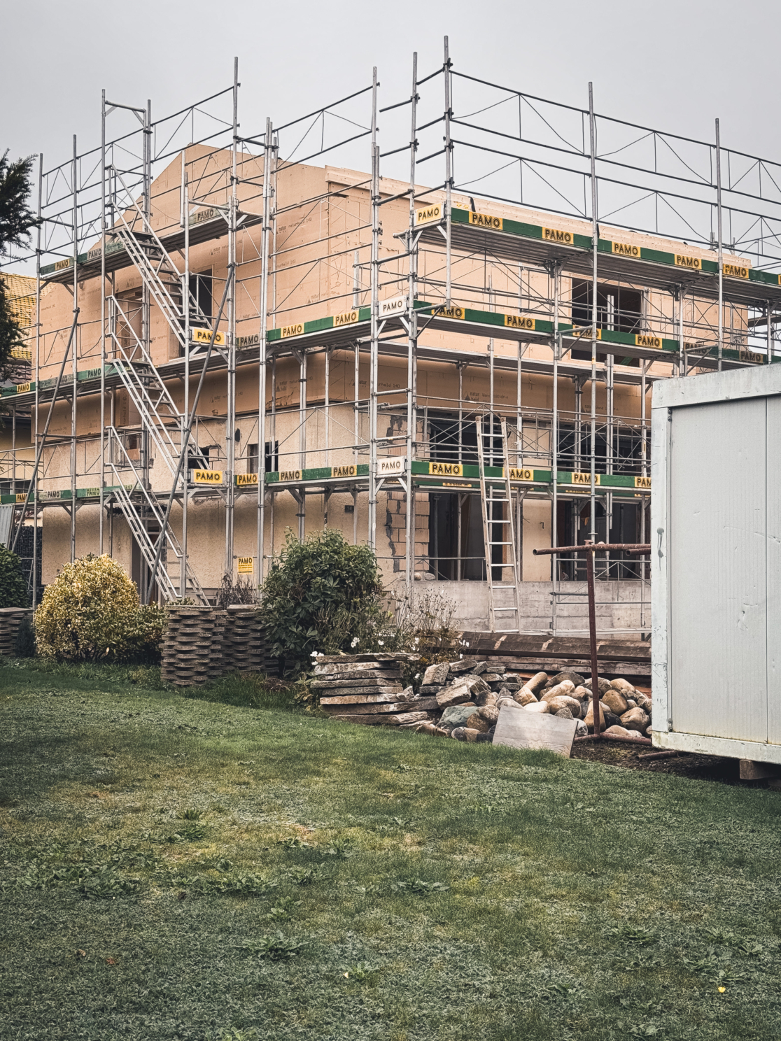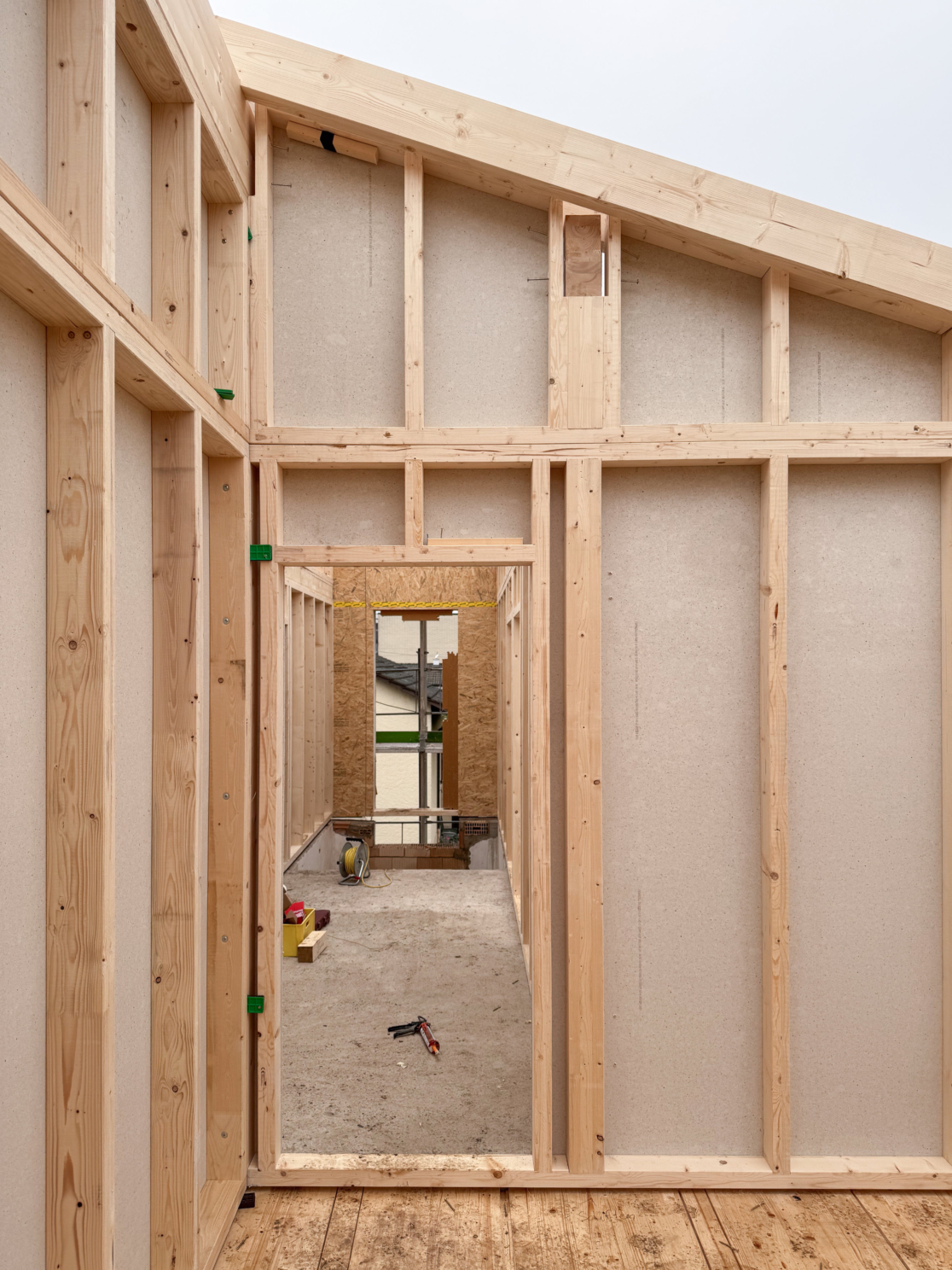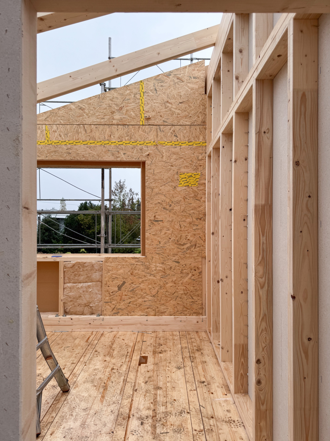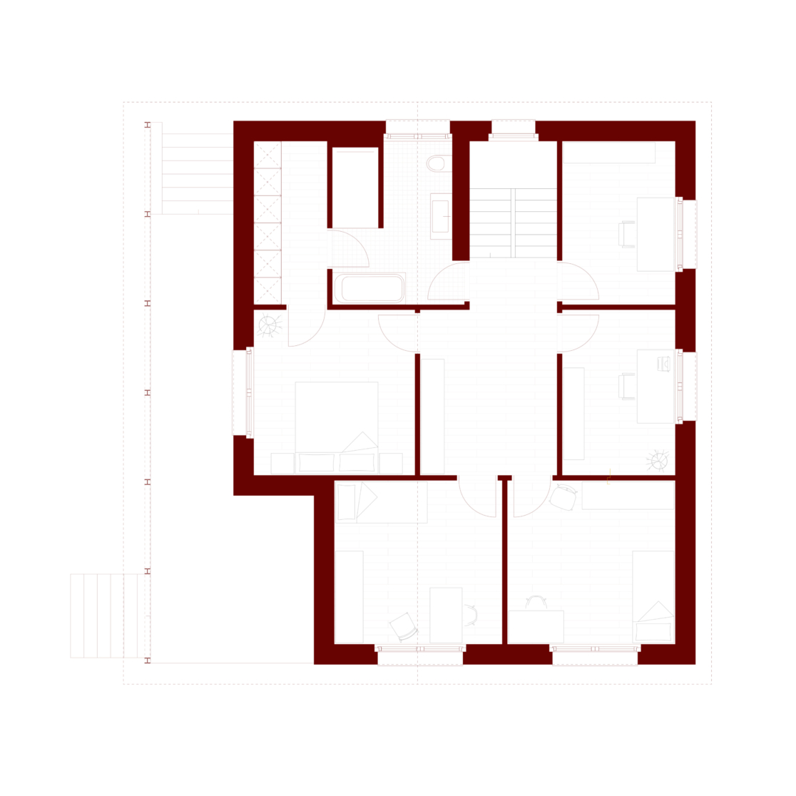 Das Dachgeschoss wird bis auf die Decke über EG rückgebaut, da bei einem Erhalt viele strukturelle Anpassarbeiten und eine Anhebung des Dachstuhls notwendig würden. Im Erdgeschoss werden für die Öffnung des kleinteiligen Grundrisses diverse Rückbauarbeiten und der Einbau von Trägern notwendig. Auf das bestehend bleibende Erdgeschoss wird eine Aufstockung vorgesehen. Nach Südwesten wird der Grundriss um eine zusätzliche Raumschicht mit Wohnzimmer im EG und zwei Zimmern im OG erweitert. Die Aufstockung und die Erweiterung werden als Holzelementbau konzipiert. Nach Westen zum Garten- und zur Eingangsseite wird eine gedeckte, zweigeschossige Veranda in ganzer Gebäudebreite vorgesehen. Diese übernimmt dabei mehrere Funktionen. Sie wird zur neuen Eingangssituation, ist eine aussenräumliche Erweiterung des Esszimmers und bietet einen gedeckten Sitzplatz in Verlängerung des Wohnzimmers. Zudem wird die im Sommer stark besonnte Westseite verschattet und sorgt für angenehmere Temperaturen in den dahinterliegenden Räumen.