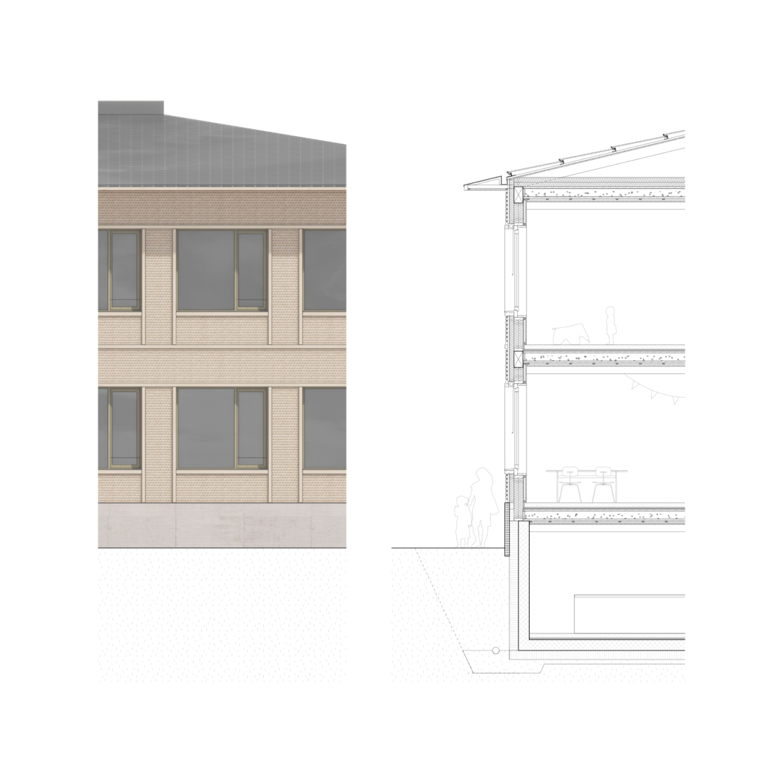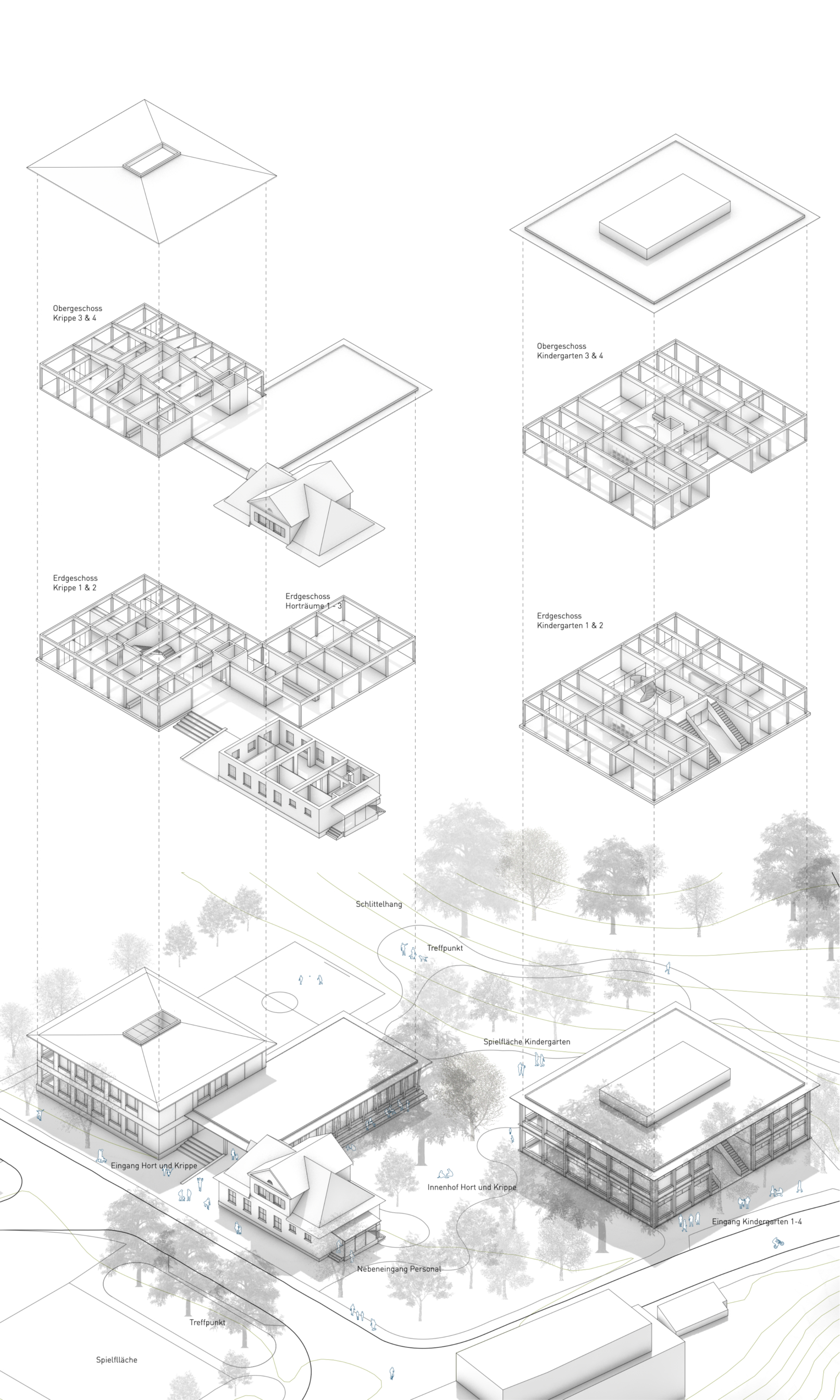 Als Gegenüber des denkmalgeschützten Bestands entsteht ein zweigeschossiger Punktbau, in welchem die Krippe untergebracht ist. Das grosszügige Dach und die Lochfassade mit Schindel-Verkleidung vermittelt ein Ausdruck von Schutz und Geborgenheit. Zwischen Altbau und Krippe, etwas von der Strasse zurückversetzt, befindet sich ein Pavillon für die Horträume. Diese haben durch die grosszügige Fensterfront einen starken Bezug zum anschliessenden Aussenraum. Weiter südlich auf der Parzelle steht als Solitär der Vierfach-Kindergarten, der durch die Platzierung zusammen mit dem Hort und dem Bestandesbau einen hofartigen Zwischenraum aufspannt und dennoch eine Eigenständigkeit aufweist. Die Fassadengestaltung erscheint konstruktiver und ergänzt zusammen mit dem Krippen- und Hortgebäude die Heterogenität des Quartiers.