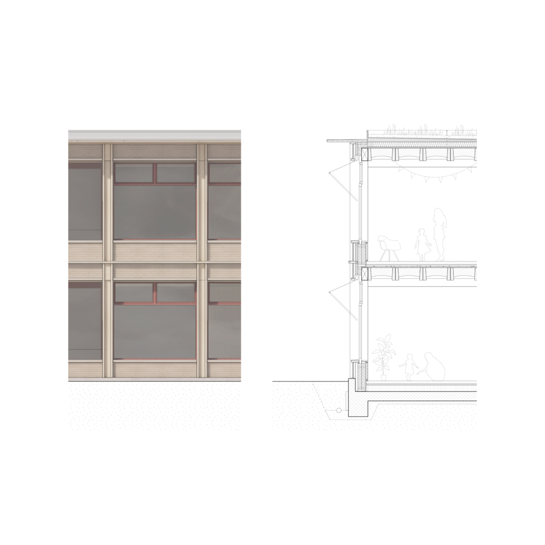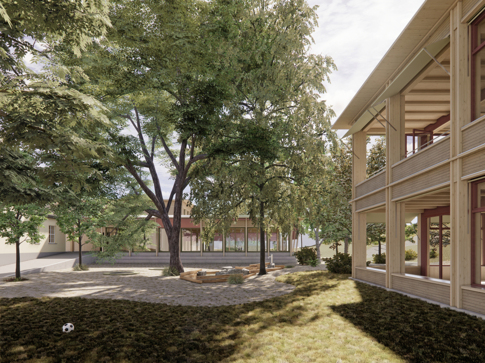 Die drei Neubauten werden grösstenteils in Holzbauweise erstellt. Holz bietet zahlreiche Vorteile: Es ist ein nachwachsender, regional verfügbarer Rohstoff mit geringerer Treibhausgas-Intensität im Vergleich zu herkömmlichen Baumaterialien und dient als natürlicher Kohlenstoffspeicher. Durch fortschrittliche digitale Fertigungsmethoden kann Holzbau wirtschaftlich mit konventionellen Bauweisen konkurrieren. Das Tragwerkskonzept von Kindergarten- und Hortgebäude orientieren sich am Skelettbau. Die Aussteifung erfolgt über die innenliegenden Wandscheiben und über die Decken- bzw. die Dachkonstruktion. Die Decken der beiden Bauten werden als Rematter Holz-Lehm-Konstruktion ausgeführt. Das Deckensystem wurde entwickelt, um höchste Anforderungen hinsichtlich Traglast, Feuerwiderstand und Schallschutz zu erfüllen. Darüberhinaus wirkt sich der Lehm positiv auf das Raumklima aus.