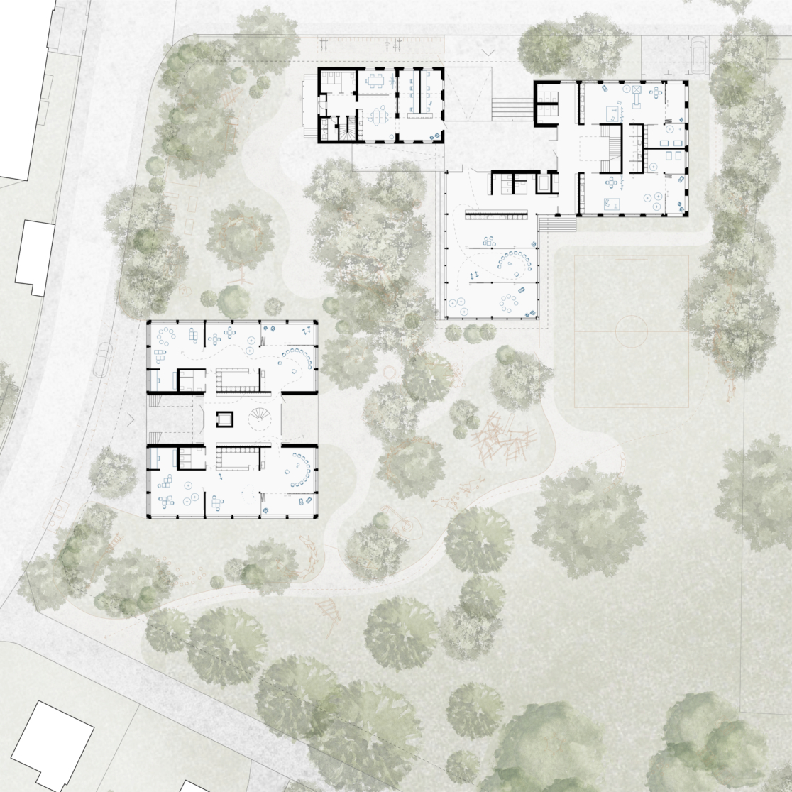 Der gesamte Freiraum wird naturnah und erlebnisorientiert weiterentwickelt – der Geissberg wird so zum Spielberg. Der heutige Aussenraum bleibt in seinen Grundsätzen und in seiner funktionierenden Raumaufteilung bestehen. Durch die versetzte Platzierung der Gebäude werden die bereits bestehenden Aussenbereiche klar getrennt und räumlich lesbar. Ostseitige wird die öffentlich zugängliche Fussballwiese mit attraktiven Sitzmöglichkeiten ergänzt. Im Zentrum bleibt die stimmungsvolle Baumgruppe hinter dem Bestandsbau erhalten und bildet eine schattige Hofsituation, die vorwiegend von den Kindern des Horts genutzt wird. Weiter südlich öffnet sich das Kindergartengebäude grosszügig zum parkartigen Freiraum, im Nu sind die Kinder draussen in der bespielbaren Natur. Bewusst platzierte Lernscapes und Spielräume sind dezent in den Schutz bietenden Baumbestand integriert.
