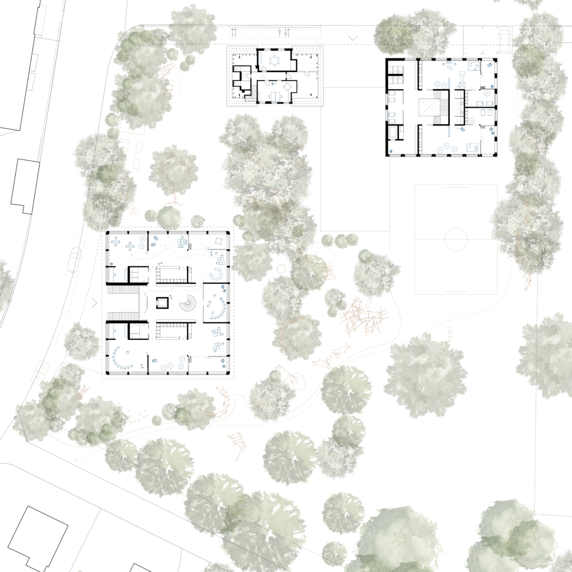 Der Bearbeitungsperimeter befindet sich in einem Wohnquartier mit heterogener Siedlungsstruktur. Freistehende Ein- und Mehrfamilienhäuser werden flankiert durch größere Bauvolumen. Zusammen mit dem angrenzenden Schrebergarten bildet die Parzelle einen grossen Freiraum innerhalb des Siedlungsgebiets. Mit dem vorgeschlagenen Projekt bleibt der offene und einladende Charakter des Ortes erhalten. Durch die sinnvolle Aufteilung des Raumprogramms auf mehrere Gebäude und die geschickte Platzierung der Bauten wird die bestehende räumliche Qualität gestärkt und erweitert. Das Projekt überzeugt durch die harmonische Einbindung in die bestehende Quartierstruktur, die vielseitig nutzbaren Räume, die nachhaltige Bauweise und die durchdachte Gestaltung der Aussenräume. Es schafft einen lebendigen, sicheren und inspirierenden Ort für Kinder und Erwachsene gleichermaßen.