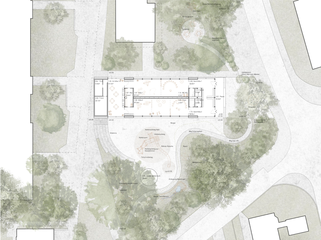 Der Aussenraum wird naturnah und erlebnisorientiert gestaltet. Er fügt sich in den bestehenden Park ein und schafft vielseitige Spiel- und Lernmöglichkeiten. Multifunktionale Spielgeräte aus naturbelassenem Holz passen sich der Umgebung an. Kletterstrukturen fördern einen fliessenden Spielrhythmus, während Sand- und Wasserspielbereiche elementare Erfahrungen bieten. Sitzpodeste, Picknicktische und Ruhezonen ergänzen das Angebot.