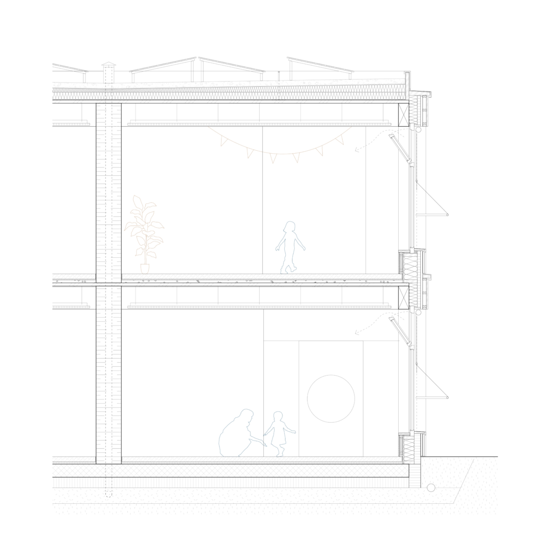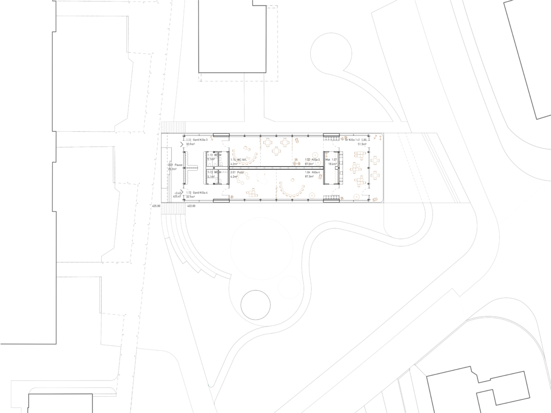 Jede Kindergarteneinheit hat einen eigenen, barrierefreien Eingang. Im Erdgeschoss sind die Zugänge südseitig, im Obergeschoss nordseitig. So entsteht eine Verbindung zum Quartier und zur Schulanlage. Vom Eingang gelangt man zur Garderobe mit direktem Zugang zu den Haupträumen. Diese sind entlang der Längsfassaden angeordnet und sind lichtdurchflutet mit starkem Bezug zum umliegenden Park. Jeweils zwei Haupträume teilen sich einen gemeinsamen Gruppenraum mit Teeküche und Materialrau.