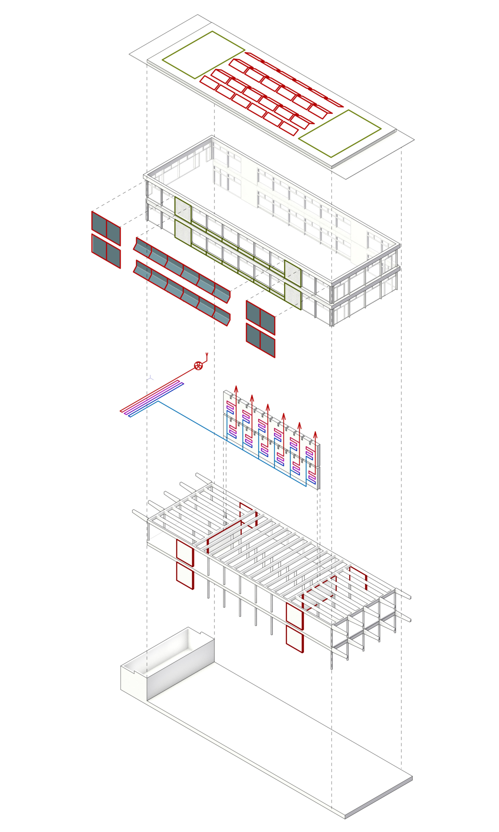 Um die Temperaturen im Sommer angenehm zu halten, ist in der Gebäudemitte eine massive Wand als Speichermasse vorgesehen. Diese wird als partizipatives Schülerprojekt aus Stampflehm ausgeführt und durch eingelegte Rohre zur schonenden Kühlung im Sommer aktiviert. Der Luftstrom wird im Nordosten angesogen und durch ein Erdregister ausgekühlt, bevor die kühle Luft auf den Lehm übertragen wird.